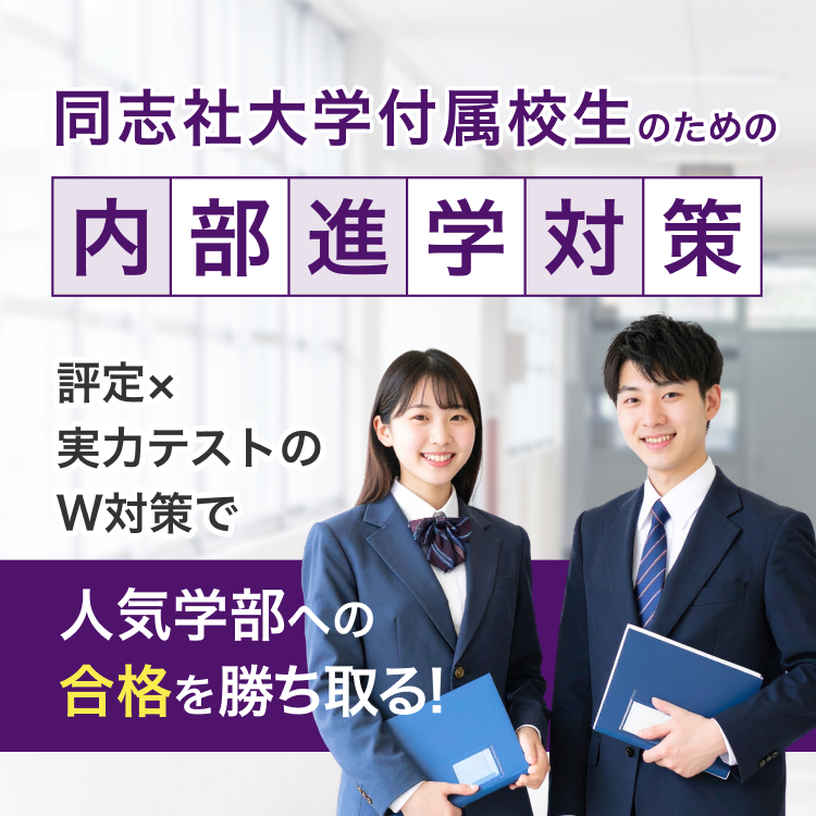 同志社大学の内部進学には、評定だけでなく高2〜高3のタイミングで実施される「実力試験」も評価基準となります。学校から配られた過去問や特別試験対策の問題集をお持ちいただければ、その教材を使った実力試験の対策指導を行うことも可能です。範囲も広い試験なので、早めに対策を始めましょう。