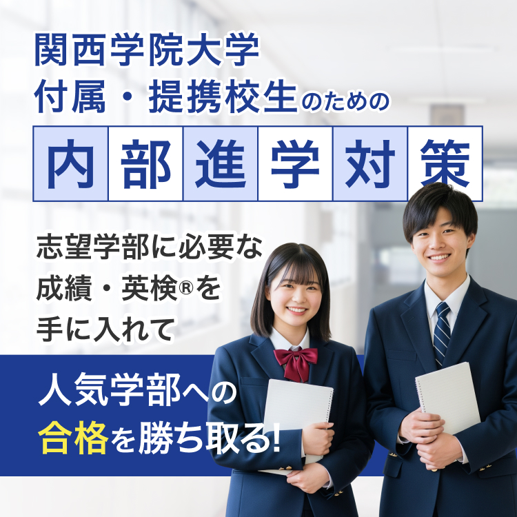 学校成績の他に、関西学院大学への内部進学基準として「英検®︎2級の取得」があります。英語は積み上げ方の教科なので、高3になってから慌てて対策をするのではなく、高1で準2級、高2で2級のように余裕を持って取得するスケジュールを立てておくのがポイントです。また英検®︎に向けた勉強は、学校のテストの成績を上げるのにも効果的なので一石二鳥です。