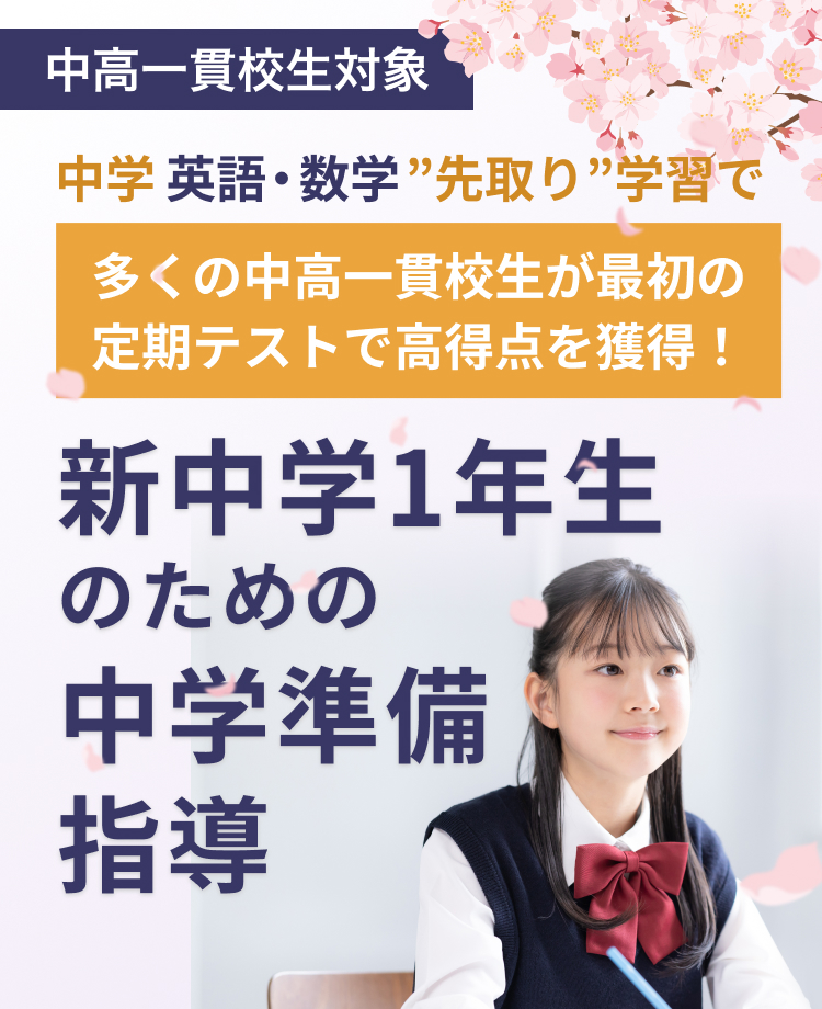 新中学1年生の入学前には、新中学1年生向けの教材を用意しております。また学校の授業が始まり、教科書やワークが進んだ段階で学校の教材を使用していきます。