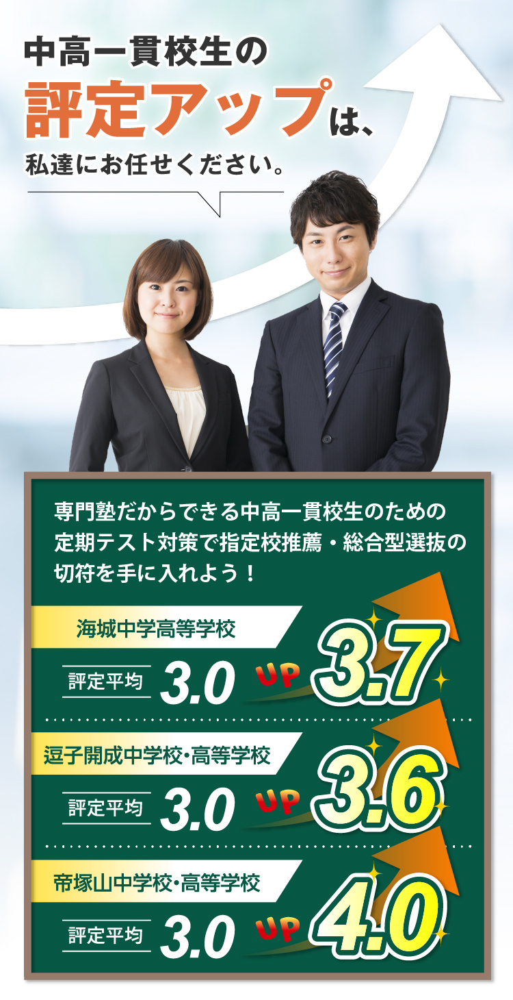 中高一貫校のカリキュラムに合わせて定期テスト対策をサポートいたします。「普段の授業についていくのが難しい」「勉強を進める上で勉強の進め方が分からない」といった授業内の悩みから学習方法の悩みまで当塾にお任せ下さい!